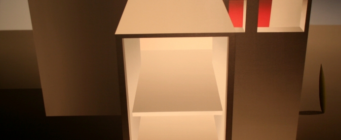 Geometrías perfectas en entornos irreales. La conjugación de sus formas rectas con elementos fantásticos crea escenas que tanto podrían ser en un futuro lejano como antes de que el hombre, tal y como lo conocemos, caminara sobre la Tierra. La arquitectura sin naturaleza, fría, tiene un aire fantasmal. Las formas nos son familiares y resultan asociables a una era tecnológica, pero su pulcritud es impropia del presente y parece más cercana a civilizaciones más evolucionadas que la nuestra. Colores fríos, grises inanimados, pero el rojo contrasta como latido vital, sangre que lleva el rastro humano a cuerpos metálicos. El rojo resulta la nota discordante, el indicio de la violencia primaria, el grito disconforme del inadaptado.